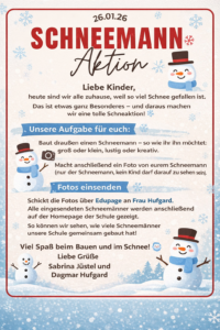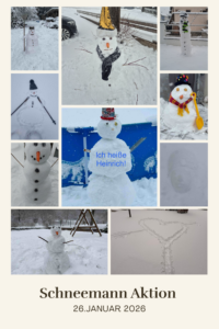 Am 26.01. haben wir aufgrund des starken Schneefalls – und dem damit verbundenen Ausfall des Präsenzunterrichts – unsere Schneemann-Aktion gestartet.
